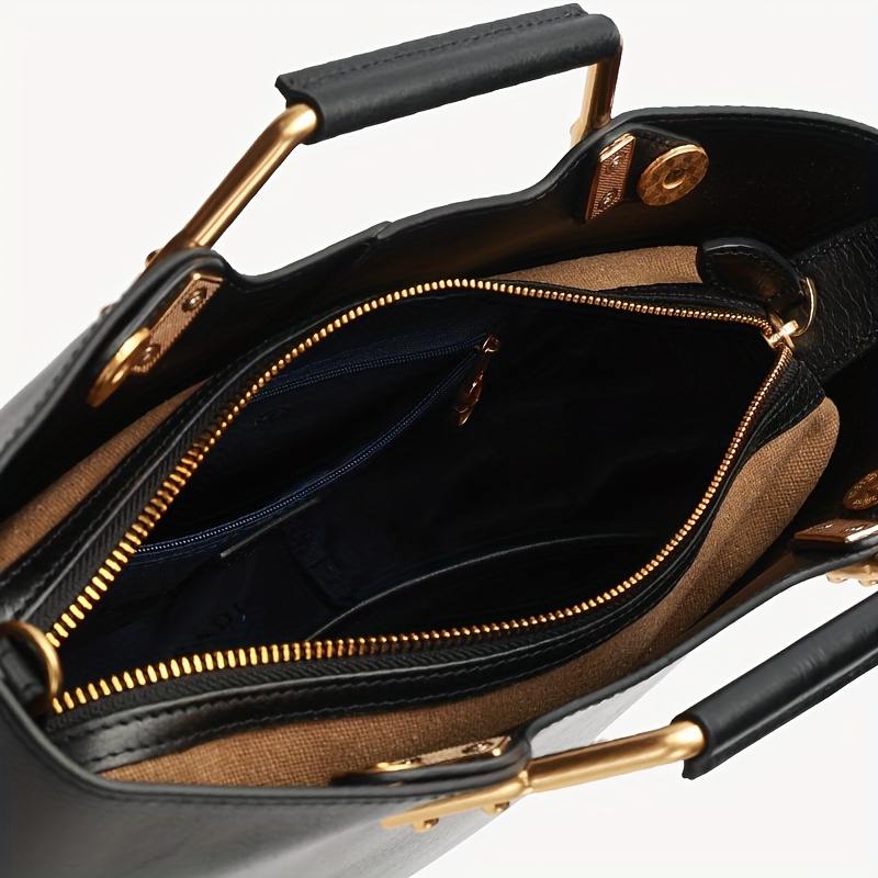 Features golden-tone hardware and zipper closure for an elegant look.